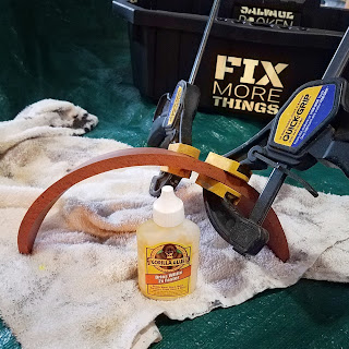 Because Gorilla Glue needs a wet surface to reach its gluing glory, we soaked the whole pot overnight. This turned out to be overkill as the glue didn't get going until the pot started to dry a bit. We began with the smallest pieces, clamping up as required by the expanding adhesive.